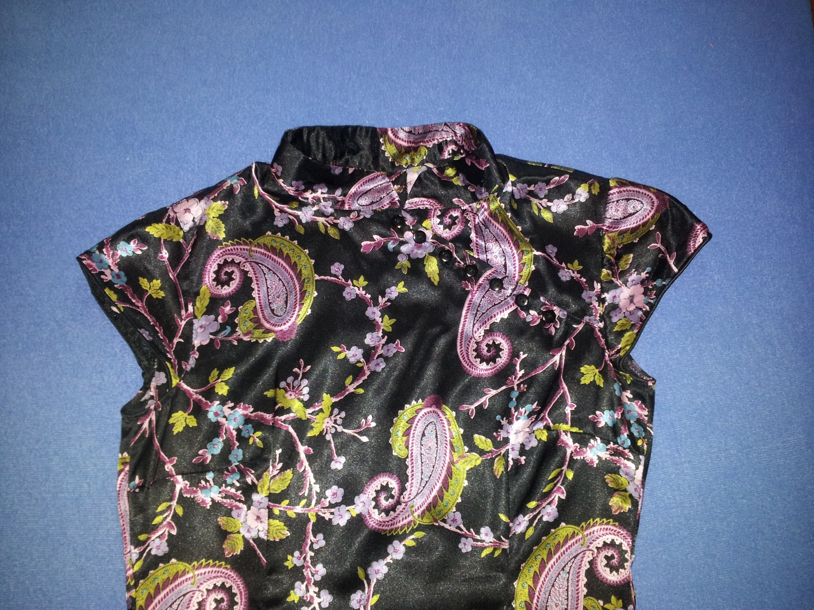 O ROCHIE DIN MATASE CROITA IMPECABIL, INTR-UN ATELIER DE CROITORIE, SE INCHUIDE IN FATA CU 7 NASTURASI NEGRI DISPUSI OBLIG SI ARE FERMOAR ASCUNS PE LATERAL, SI UN SLIT LA SPATE. CULORI VERDE MOV, VIOLET, ALBASTRU PE FOND NEGRU
